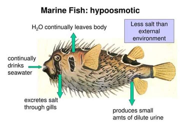Water will diffuse into the fish, so it excretes a very hypotonic (dilute) urine to expel all the excess water. A marine fish has an internal osmotic concentration lower than that of the surrounding seawater, so it tends to lose water and gain salt. They retain urea in their blood in relatively higher concentration.