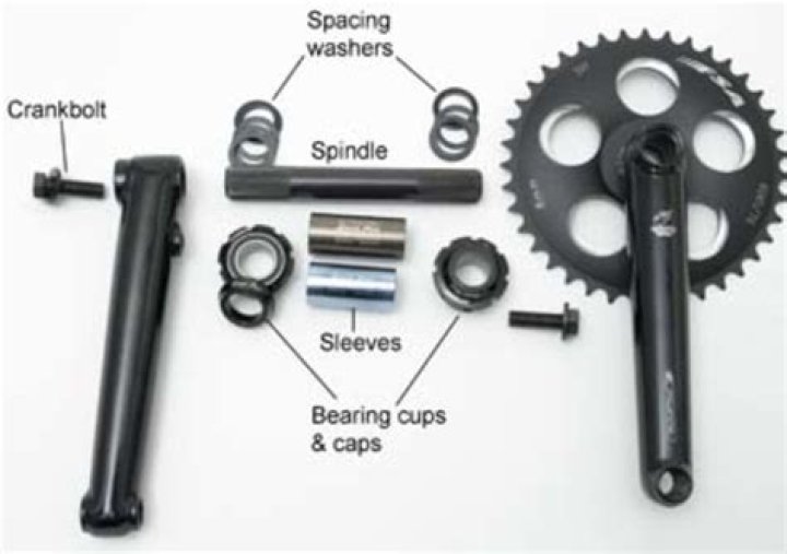 Three-piece cranks consist of two individual crank arms and a spindle and are made from a variety of different materials. Three-piece cranks generally are stronger than one-piece cranks.