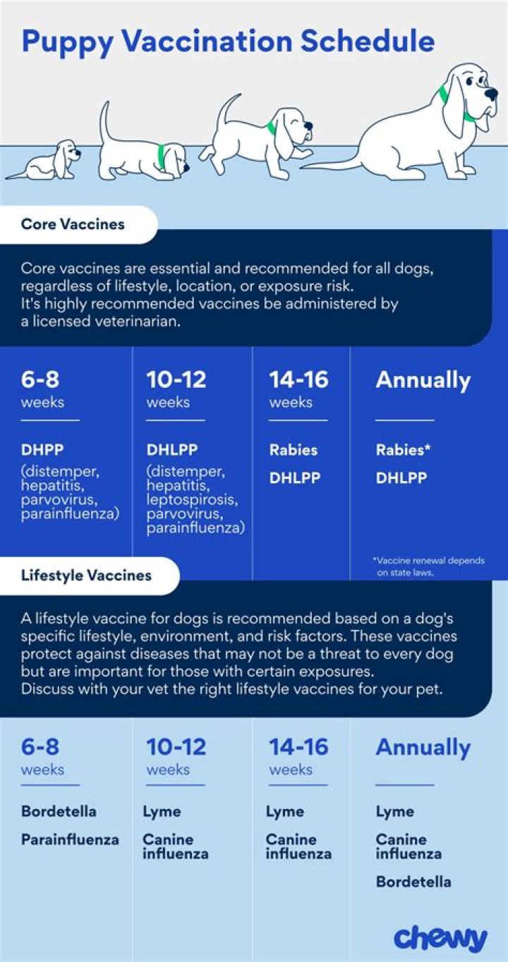 Puppy Vaccination Schedule Puppy’s Age Recommended Vaccinations 6 — 8 weeks Distemper, parvovirus 10 — 12 weeks DHPP (vaccines for distemper, adenovirus [hepatitis], parainfluenza, and parvovirus) 16 — 18 weeks DHPP, rabies 12 — 16 months DHPP, rabies.