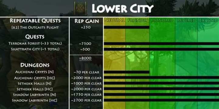 Lower City is a Shattrath City-based faction in TBC. Most of the reputation with them is obtained by killing Arakkoa and Cabalists in various dungeons, and by doing one-time quests. Lower City offers a variety of powerful pre-raid items and many unique profession patterns.