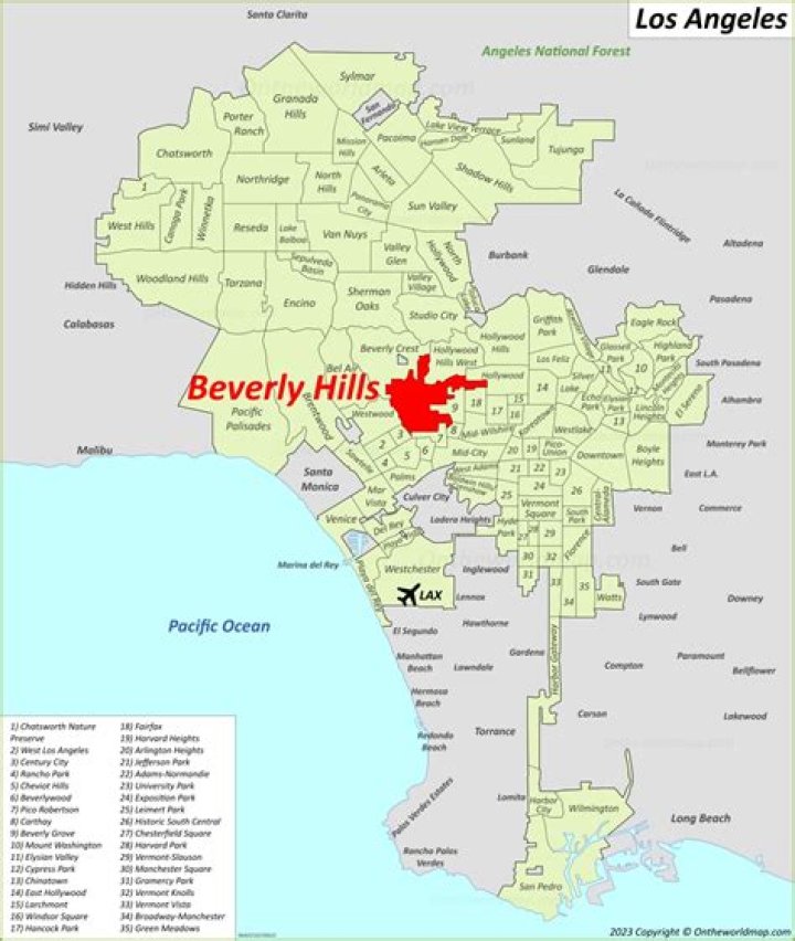 Beverly Hills is a city in Los Angeles County, California. Located within 5.71 square miles (14.8 km2), and surrounded by the cities of Los Angeles and West Hollywood, it had a population of 34,109 at the 2010 census, and an estimated population of 33,792 in 2019.