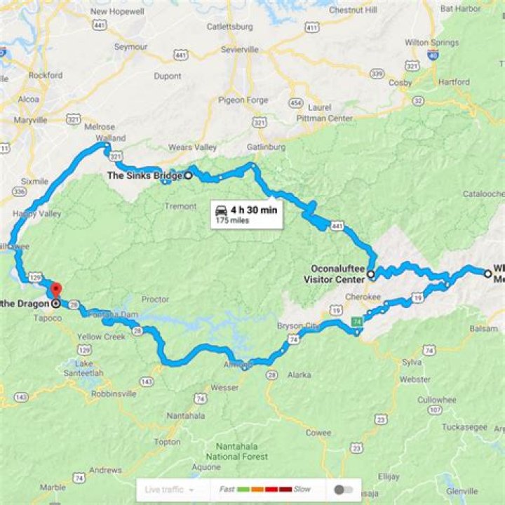 Coming from Gatlinburg, TN, the quickest way to reach the Tail of the Dragon is as follows: Take US 411 S from downtown into the Great Smoky Mountains National Park. After about 2 miles, take a right onto Little River Road (TN 73) at the Sugarlands Visitor Center and continue all the way into Townsend (US 321 West).