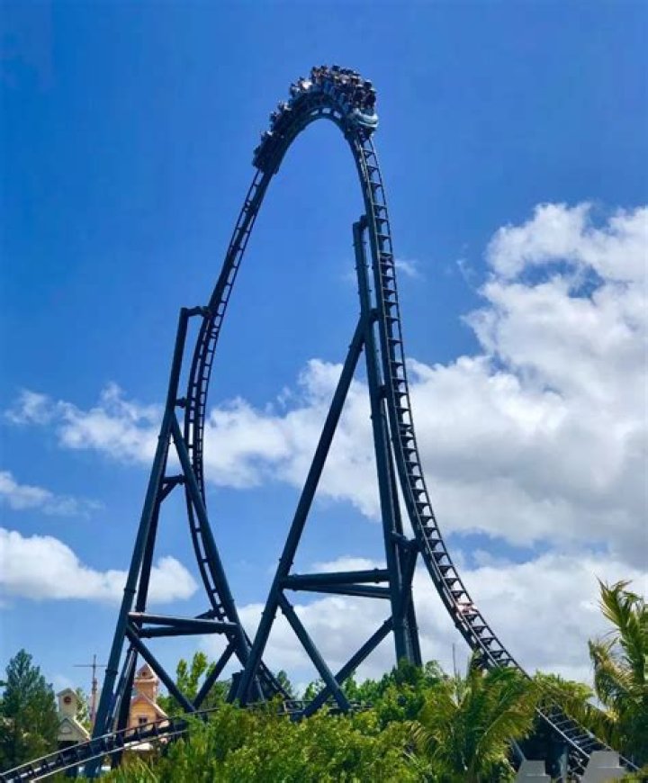 It involves not one but two 70 mph launches in three minutes, and includes some of the most ambitious and terrifying moves I’ve ever seen. There’s a “top hat” that rockets you 155 feet in the air and then immediately drops you into an 80-degree plummet, and that’s only halfway through the ride.