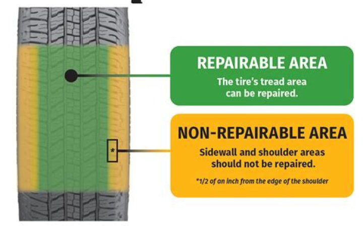 Industry guidelines allow repair of punctures of up to 1/4″ in diameter in a tire’s tread area. Some manufacturers limit the number of repairs permitted (usually two) and how close they can be (no closer than 16″ apart). Repair of any punctures in the shoulder and sidewall areas are not permitted.
