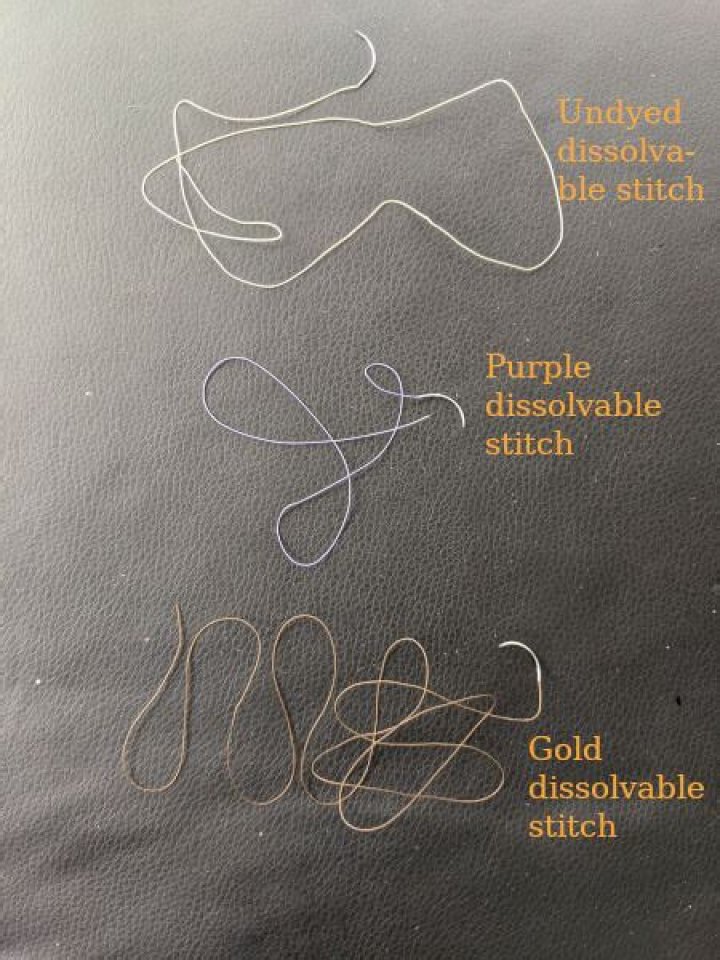 Generally absorbable sutures are clear or white in colour. They are often buried by threading the suture under the skin edges and are only visible as threads coming out of the ends of the wound. The suture end will need snipping flush with the skin at about 10 days.