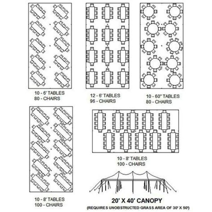 Using a 20×40 canopy, a maximum of twelve 8′ banquet tables could be used, with 96 chairs (72 chairs if not using the table ends). For the same 20×40 canopy, 5′ round tables could be used as shown in the third example, using ten 5′ round tables and 80 chairs.