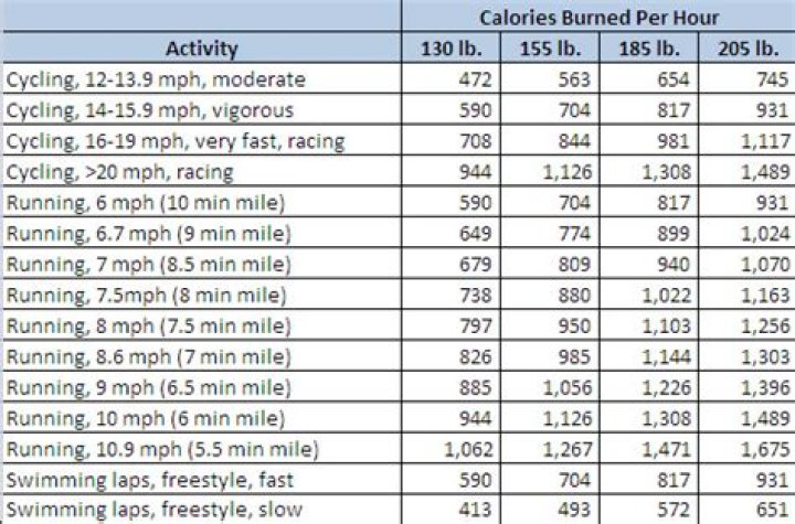 From the table of results, if you weigh 175lb and you cycled for 1 hour at 10mph then you would burn 567 calories (10 miles). If you cycle at 12mph then they would burn 572 calories (12 miles).