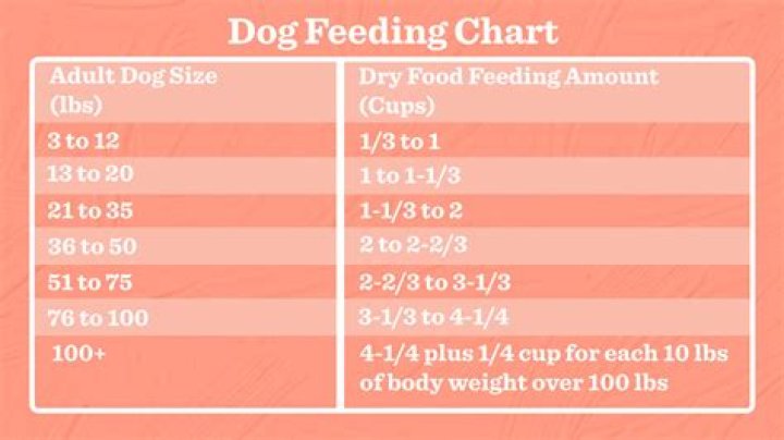 What are Dog Feeding Charts? Adult Dog Size (lbs) Dry Food Feeding Amount (Cups) 26 to 50 2 to 2-2/3 51 to 75 2-2/3 to 3-1/3 76 to 100 3-1/3 to 4-1/4 100+ 4-1/4 plus 1/4 cup for each 10 lbs of body weight over 100 lbs.