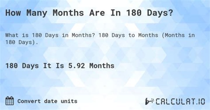 Answer and Explanation: 180 days equals roughly 6 months. A month contains 30 or 31 days, except for February.