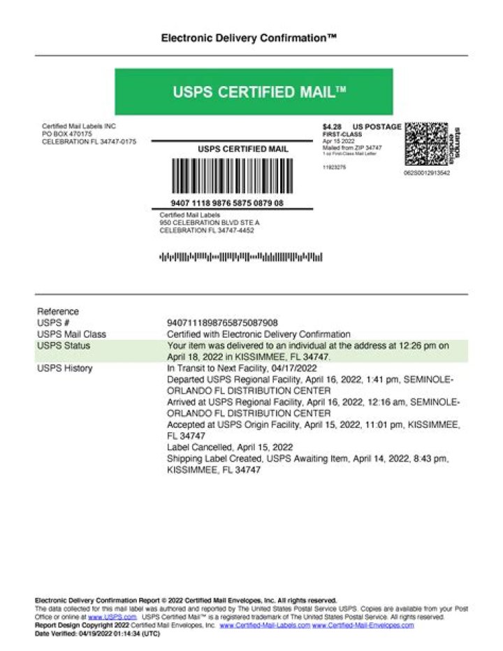 It can also be viewed online at for 90 days. Your Certified Mail Labels account will automatically display the DELIVERED stamp with the date and time stamp authored officially by the United States Postal Service as legal proof or evidence your Certified Mail item was delivered.