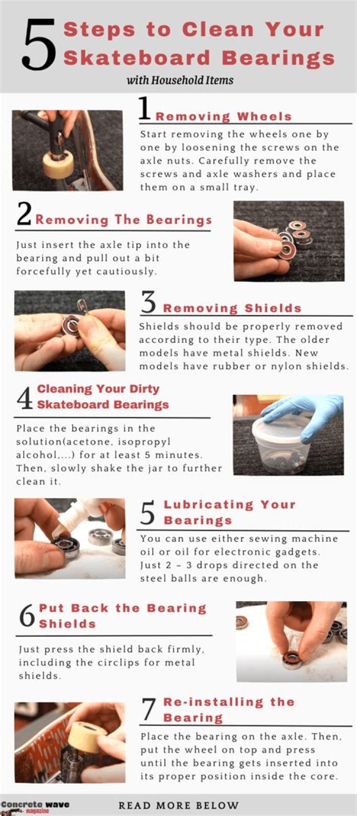 “You’ll need to remove the bearing shields if your bearings have them. Just poke them out with a paper clip. Then soak your bearings in acetone, nail-polish remover or rubbing alcohol. WD40 or others like it will dry out your bearings and attract dust and dirt.