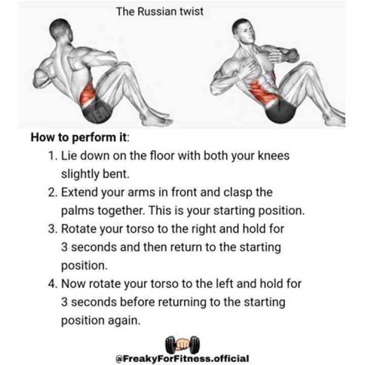 Benefits:Russian twists works more than just your abdomen. It engages all the abdomen muscles and strengthens the rectus abdominis, internal obliques and the external obliques.