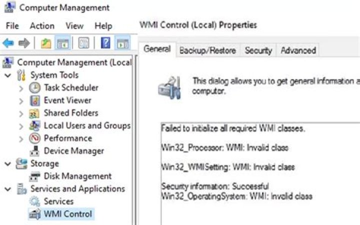 Confirm WMI is broken Launch the WMI MMC snapin: go to Start -> Run -> type wmimgmt.msc. Right click WMI Control (Local) and click Properties. If WMI is working correctly, you will see Successfully connected window as shown below. If you see Invalid class or any other error message then WMI is not working properly.