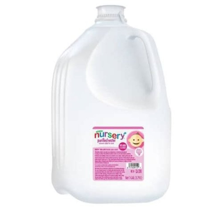 Nursery Water is purified bottled water, marketed exclusively for babies. Any bottled water that’s low in fluoride and has labels indicating it’s been purified, distilled, deionized, demineralized, or has gone through reverse osmosis, is fine.