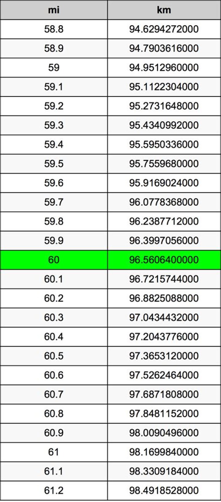 Miles to kilometers conversion table Miles (mi) Kilometers (km) 0.1 mi 0.16093 km 1 mi 1.6093 km 2 mi 3.2187 km 3 mi 4.8280 km.