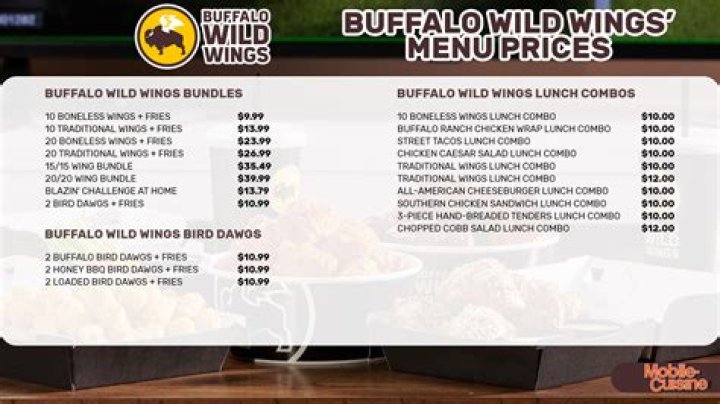 Buffalo Wild Wings Menu With Prices (Updated: November 2021) Food Price Traditional Wings $10.99 Traditional Wings $15.99 Traditional Wings $19.99 Boneless Wings $6.79.