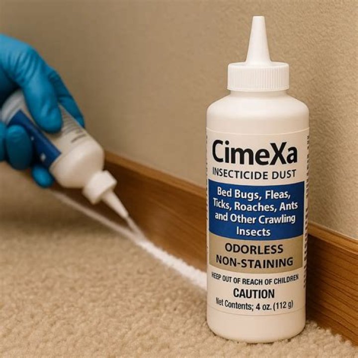 CimeXa is a one step insecticidal dust that, for the best effect, should be dry dusted a barely visible layer on as many horizontal or vertical surface as possible and that’s a crack, crevice or void out of the light where bedbugs may hide in furniture (hidden areas), some personal items (not electronics) and.