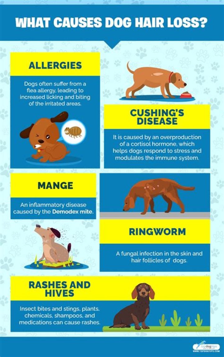 5 Common Causes of Hair Loss in Dogs Allergies. Allergies are a frequent cause of hair loss in dogs. Infection or Infestation. An infestation with parasites such as fleas, ticks, and mites (scabies, mange) is another source canine alopecia. Cushing’s Disease. Genetics. Pressure Sores.