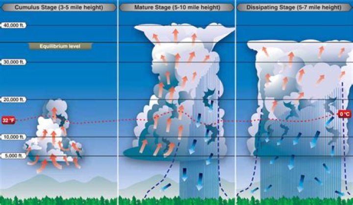 Their dark bases may be no more than 300 m (1000 ft) above the Earth’s surface. Their tops may extend upward to over 12,000 m (39,000 ft). Tremendous amounts of energy are released by the condensation of water vapor within a cumulonimbus.