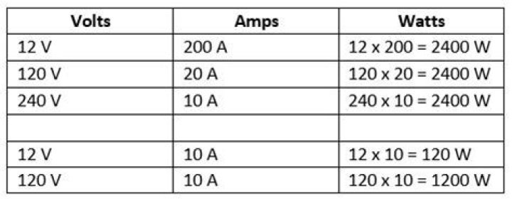 Equivalent Volts and Amps Measurements Voltage Current Power 12 Volts 5.417 Amps 65 Watts 12 Volts 5.833 Amps 70 Watts 12 Volts 6.25 Amps 75 Watts 12 Volts 6.667 Amps 80 Watts.