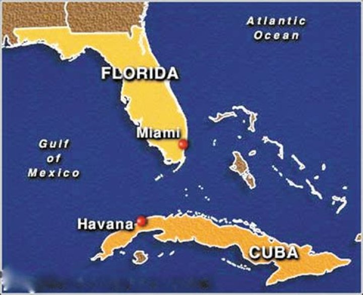 Cuba is about 90 miles south of Florida. This is the shortest distance between Florida’s Key West Island and Cuba’s capital, Havana. The water distance across the Strait of Florida is given in nautical miles for the purpose of sea navigation by large ships. The actual distance is about 103 miles.