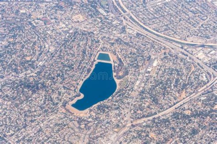 The reservoir and surrounding neighborhood are overlooked by the Hollywood Sign. The reservoir is created by the Mulholland Dam, built in 1924, designed by the Los Angeles Department of Water and Power, then named the Bureau of Water Works and Supply, as part of the city’s water storage and supply system.
