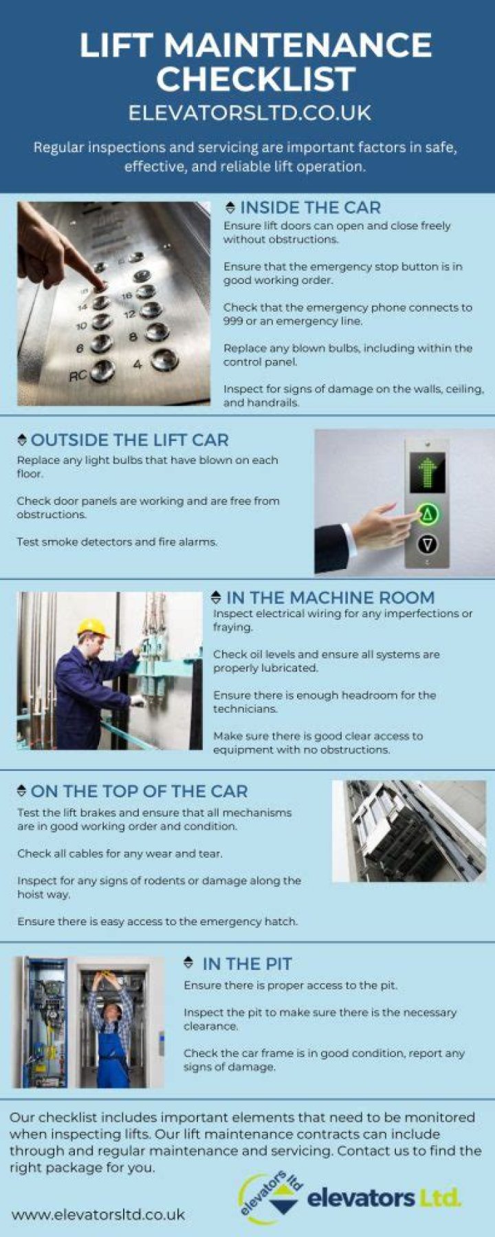Follow these five easy tips to to ensure proper maintenance and safe and secure travel. Keep a log of your elevator’s operational problems. Conduct daily inspections. Don’t keep malfunctioning equipment hanging around. Avoid industrial cleaners. Stick to the recommended weight guidelines.