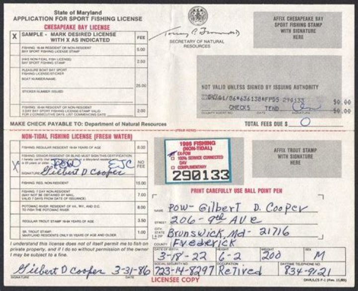 A complimentary lifetime license is available to Maryland residents who are 100% service connected disabled veterans or former prisoners of war. The license incorporates the non-tidal angler’s license, Chesapeake Bay sport fishing license and trout stamp.