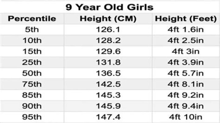 Height by age Age (years) 50th percentile height for girls (inches and centimeters) 8 50.2 in. (127.5 cm) 9 52.4 in. (133 cm) 10 54.3 in. (138 cm) 11 56.7 in. (144 cm).