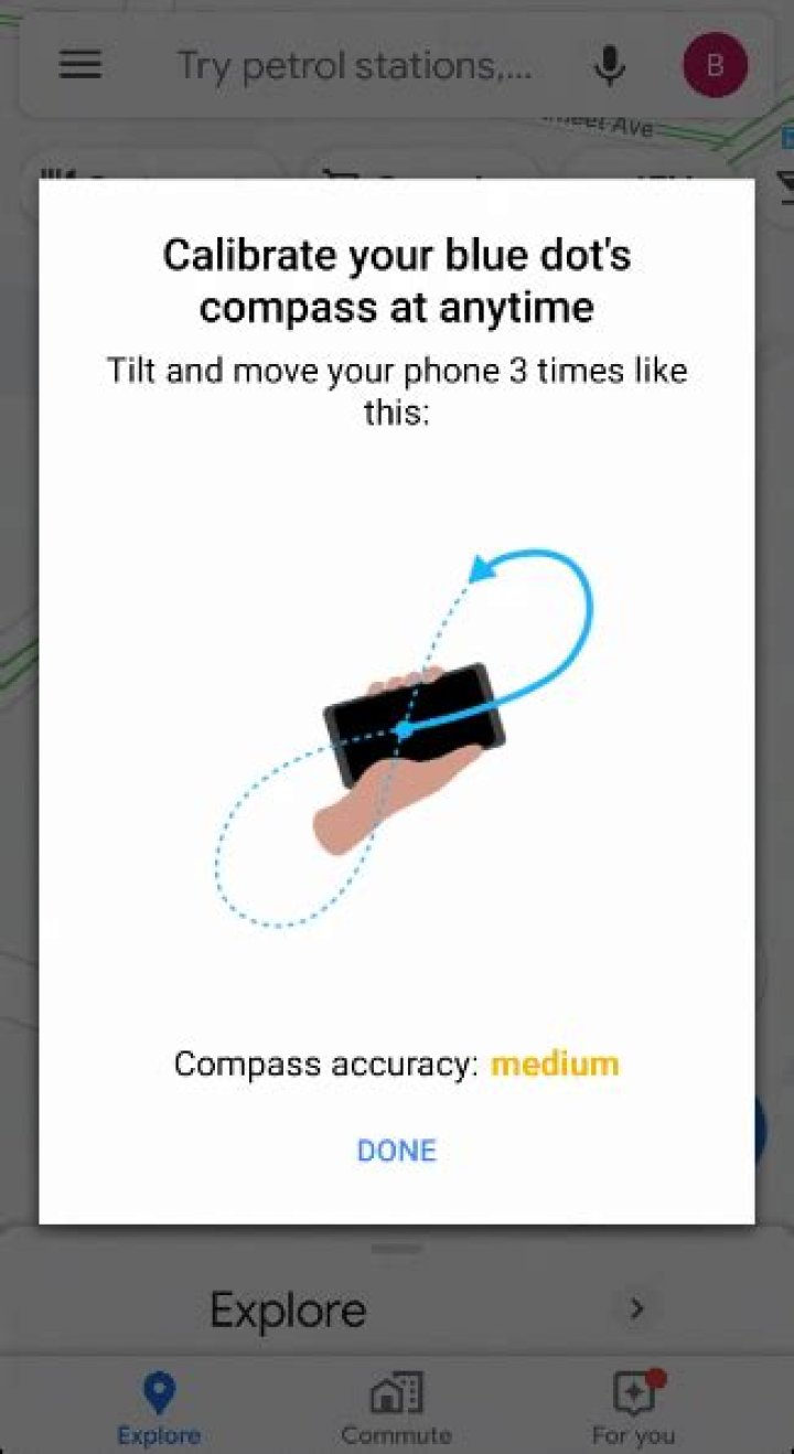 Open the Google Maps app, making sure that your blue circular device location icon is in view. Tap on the location icon to bring up more information about your location. At the bottom, tap the “Calibrate Compass” button. This will bring up the compass calibration screen.