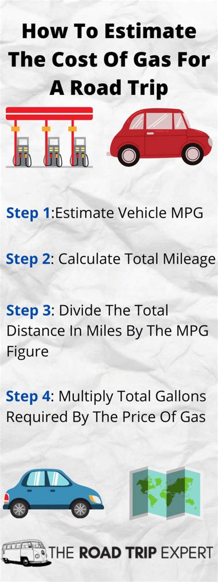 Take the mileage of the total distance of your trip and divide it by your miles per gallon to get the number of gallons of gas you will need on your trip. Then multiply that figure by the current price of gas, and the result is the estimated cost of gas for your road trip.
