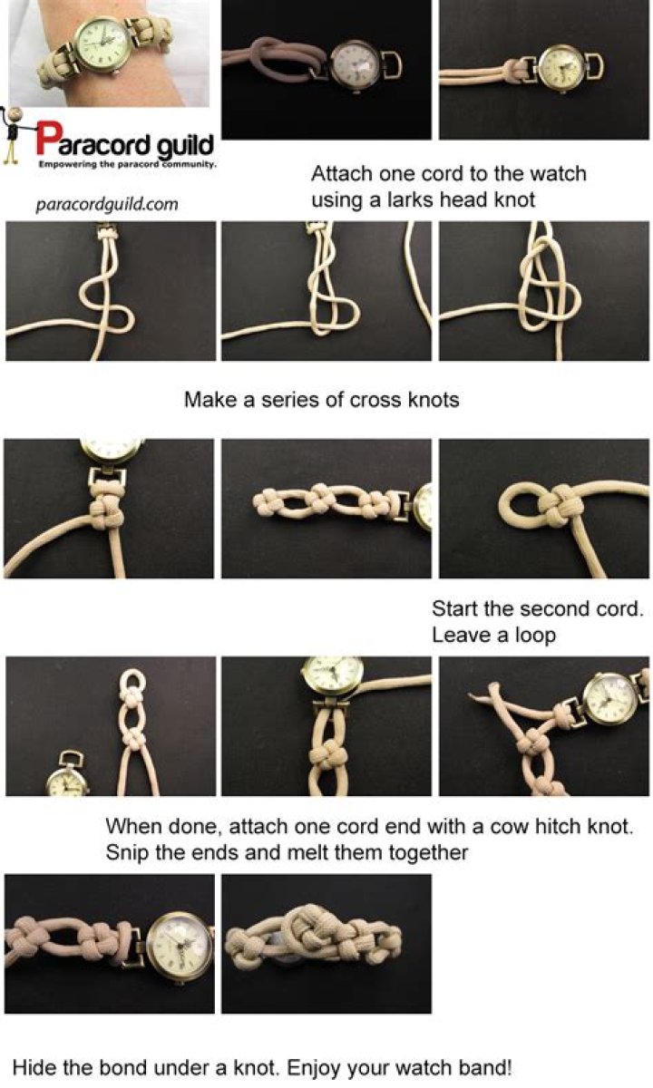 WHAT YOU’LL DO Melt both ends of the paracord with the lighter. Wrap the paracord around a wrist comfortably and mark it. Loop the cord through the female end of the buckle and draw tight. Pass both cords though the pins and under the watch. Pass the long and short codes back through the pins and under the watch.