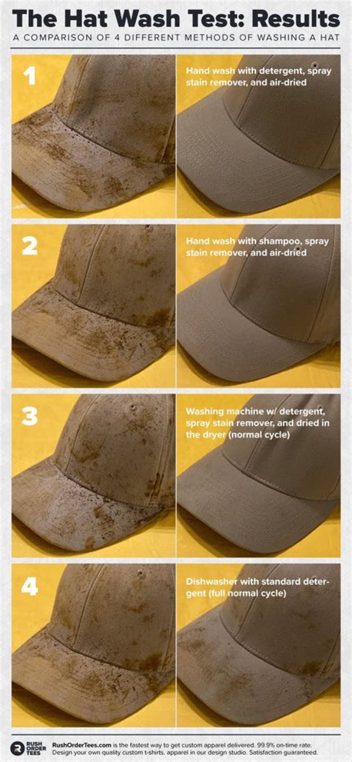 1. Get Sweat Stains Out of Hats by Hand Washing Fill a sink or bucket with warm water. Add 1 tablespoon of powdered or liquid laundry detergent. Spot treat stains. Place the hat in the water and swish it around a few times. Rinse with cool water. Let the hat air dry.