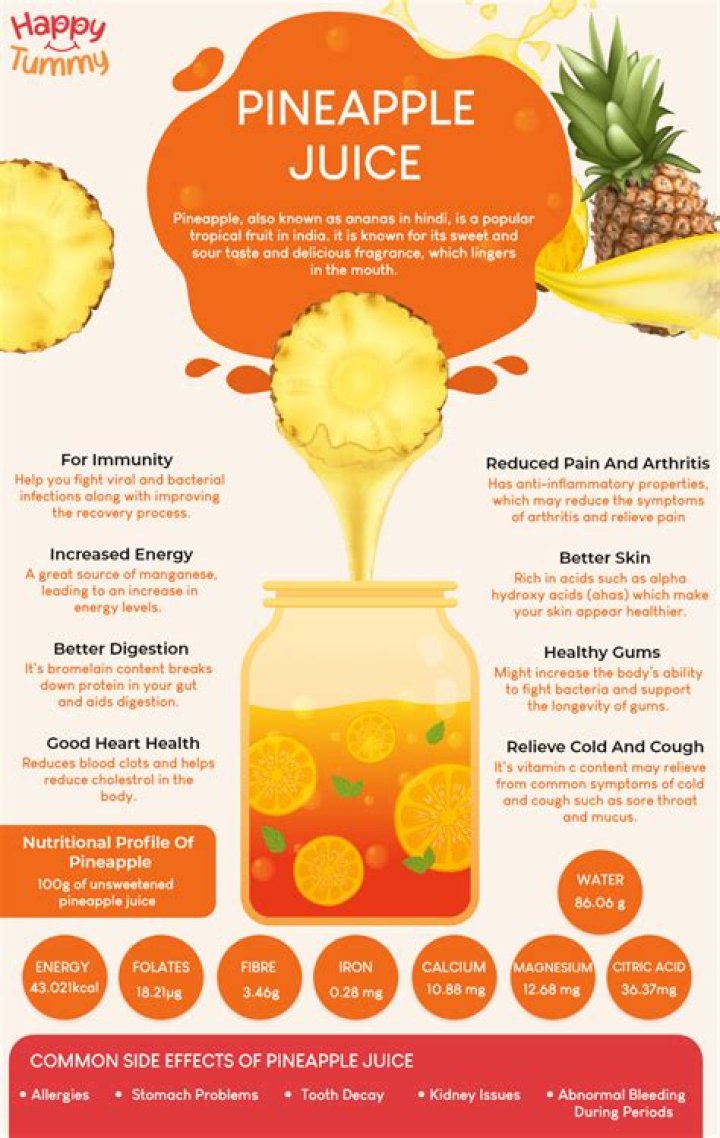 Modern research has linked pineapple juice and its compounds to health benefits, such as improved digestion and heart health, reduced inflammation, and perhaps even some protection against cancer.