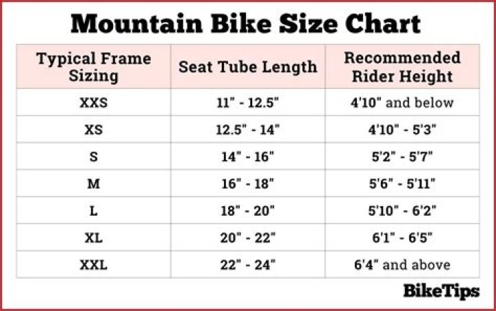 Mountain Bike Size Chart Rider Height (in) Rider Height (cm) Frame Size 5′ 3″ – 5′ 6″ 159cm – 168cm S 5′ 7″ – 5′ 10″ 169cm – 178cm M 5′ 11″ – 6′ 1″ 179cm – 185cm L 6′ 2″ – 6′ 4″ 186cm – 193cm XL