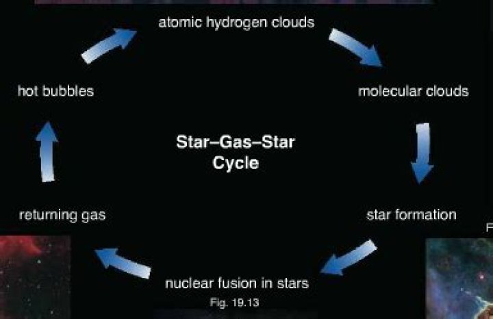 4) Briefly describe the star-gas-star cycle. Answer: During a star’s lifetime, it fuses hydrogen into helium and helium into carbon. The interstellar medium cools, forms molecular clouds, and then forms new stars, which are made out of the material of the interstellar medium.