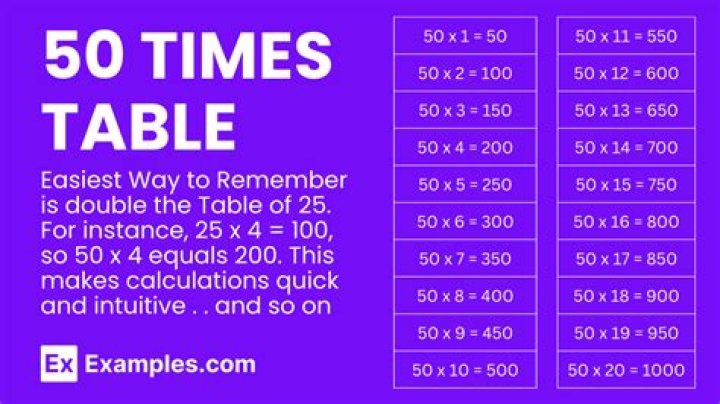 Table of 50 is a multiplication table that results in the product of consecutive natural numbers with the number 50. For example, two times 50 = 50 + 50 = 100, three times 50 = 50 + 50 + 50 = 150, and so on. You can print or save this times table chart as a PDF by clicking the link provided below.