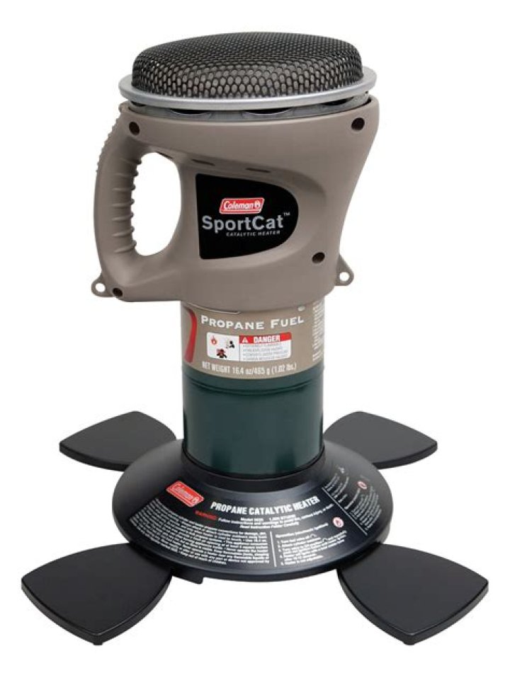 The Coleman SportCat catalytic heater is a safe, portable propane tent heater that is ideal for cold weather camping. The 1,500 BTU output operates up to 14 hours from one 16.4-ounce propane cylinder (not included), and a portable integrated handle makes the heater easy to carry.