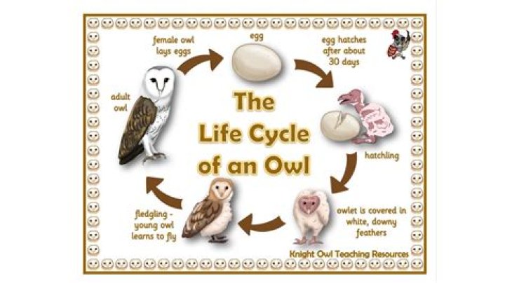 First, the owl is inside an egg. Then it becomes a hatchling, a newly hatched baby owl. Next it is a nestling, a young owl confined to the nest. After that, the owl becomes a fledgling, a young owl learning how to fly.