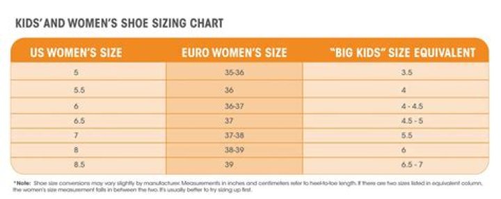 Step 5: Use the below kids’ shoe size to women’s size chart to determine your correct size. Women’s Size Kids’ Size 5.5 3.5 6 4 6.5 4.5 7 5.
