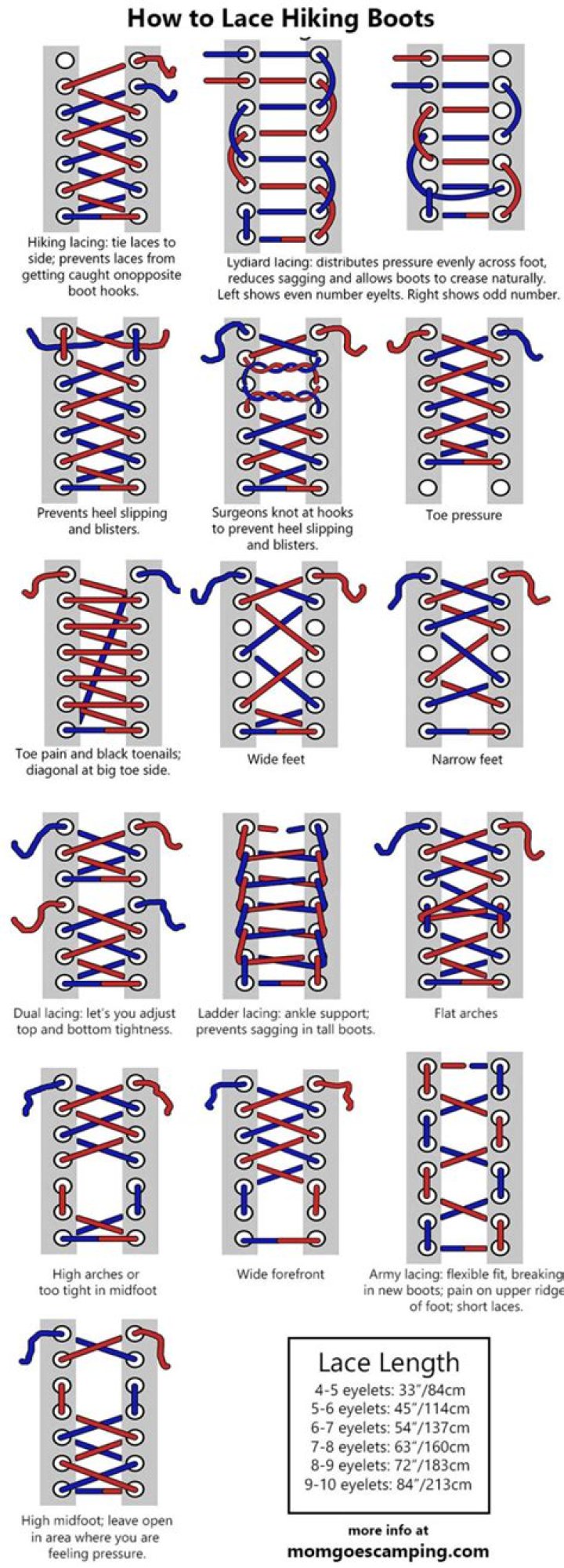 Boot Laces Length Chart Number of Eyelets Length of The Bootlace (inches) Type of Boot From 3 to 4 30 Street From 4 to 5 36 Street From 5 to 6 45 Hiking (Low top) From 6 to 7 Up to 54 Work and Hiking.