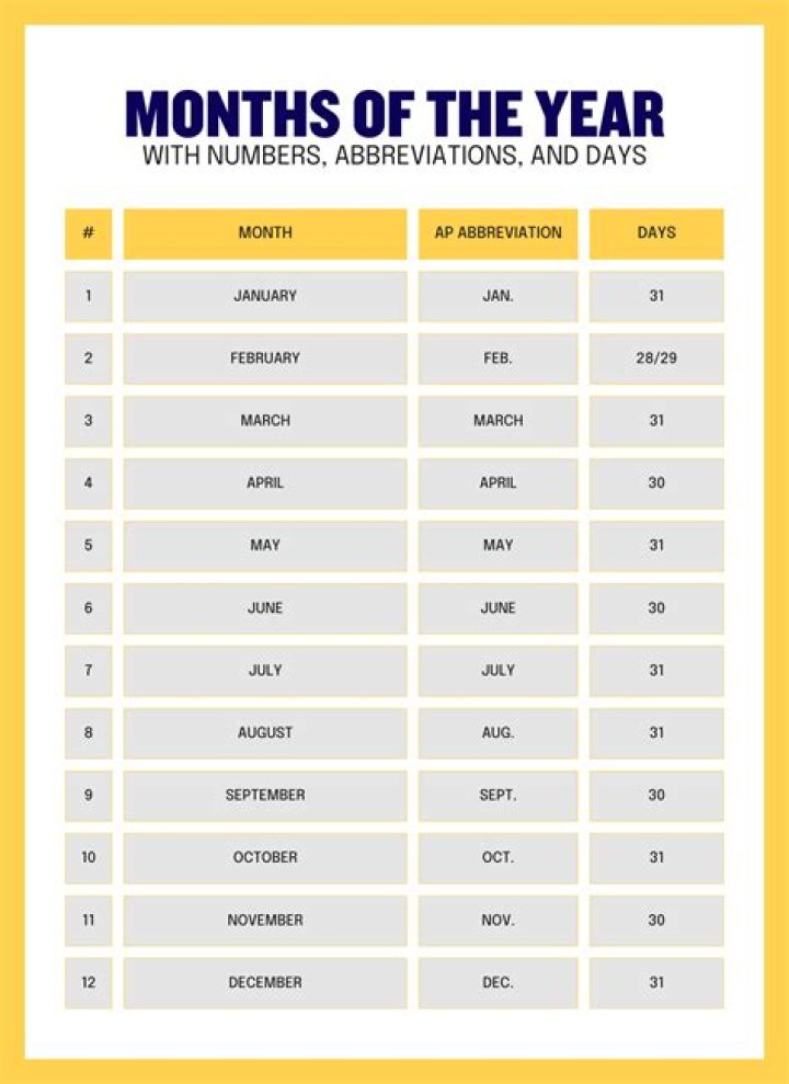 Months Month Number Month Days in Month 1 January 31 2 February 28 (29 in leap years) 3 March 31 4 April 30.
