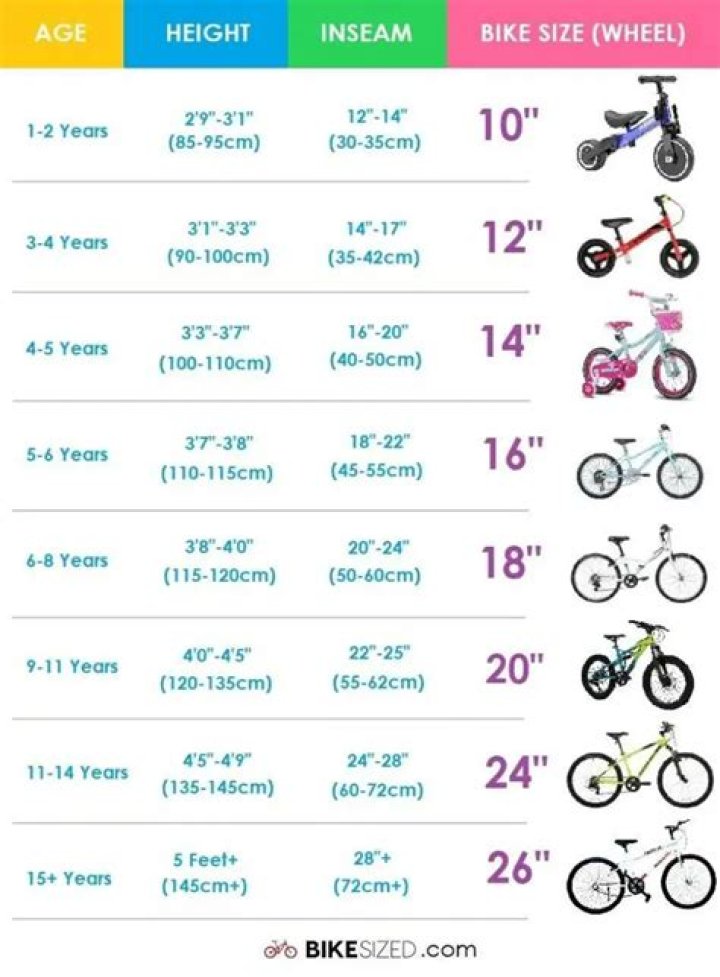 Guide to Kids’ Bike Sizing Bike Wheel Child Height (in.) Approx. Age 16-inch 39-48 5-8 20-inch 42-52 6-10 24-inch 50-58 8-12 26-inch 56+ 10+.
