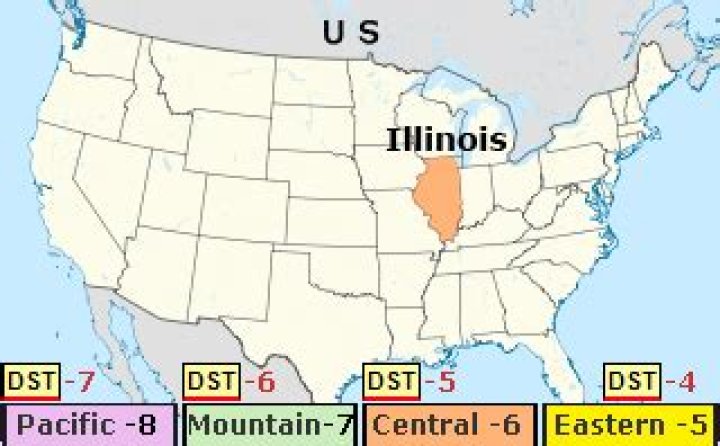 Illinois is in the Central Time Zone in the United States of America (USA). US Central Standard Time (CST) is 6 hours behind Greenwich Mean Time ( GMT-6 ).