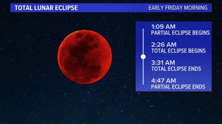 Best time to look for the eclipse In the eastern time zone, the eclipse will begin around 1 a.m. Friday, “but you won’t be able to see a difference in the moon with your naked eyes until approximately 2:20 a.m.,” Bakley noted. “At around 4:04 a.m. the eclipse will reach its peak.19 hours ago.