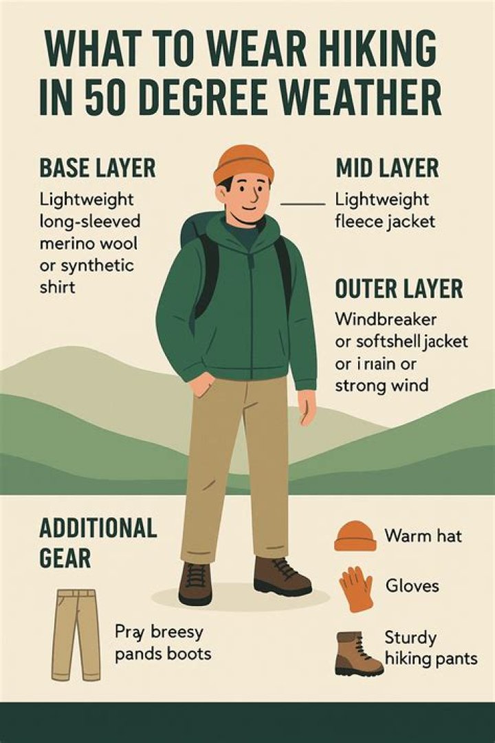 What to Wear Hiking in 50-60 Degrees Synthetic underwear and moisture-wicking hiking socks. Lightweight polyester or merino wool base layer top and bottom. Synthetic mid-layer, like a lightweight fleece jacket or quarter-zip pullover. Synthetic hiking pants. Light waterproof/breathable rain jacket and pants if needed.