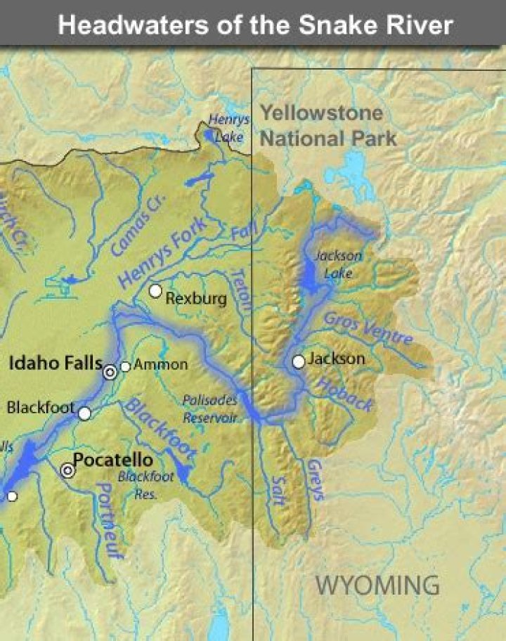 The Snake River rises in western Wyoming, then flows through the Snake River Plain of southern Idaho, the rugged Hells Canyon on the Oregon–Idaho border and the rolling Palouse Hills of Washington, emptying into the Columbia River at the Tri-Cities, Washington.