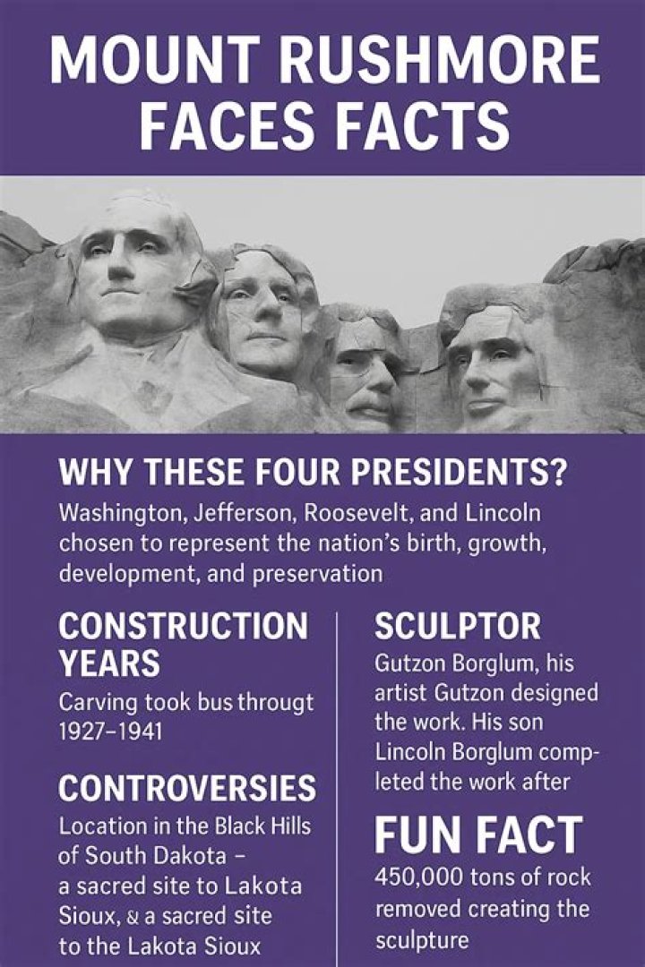 Top 10 Facts about the Mount Rushmore It is not as big as it appears in pictures. The local Indian tribe opposed the sculpting of Mount Rushmore. Dynamite was used in carving the granite on Mount Rushmore. About 400 workers built the sculptures. The massive sculptures were the brainchild of historian Doane Robinson.