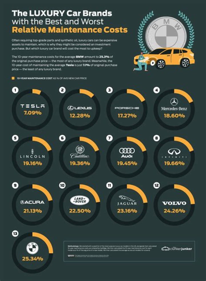 Luxury Cars with the Lowest 10 Year Maintenance Costs Tesla Model 3. View the Tesla Model 3 maintenance schedule, predicted probaility of major repairs and expected costs per year. Tesla Model S. Tesla Model Y. Lexus ES 350. Lexus ES 300h. Lexus IS 350. Lexus GS 350. Tesla Model X.