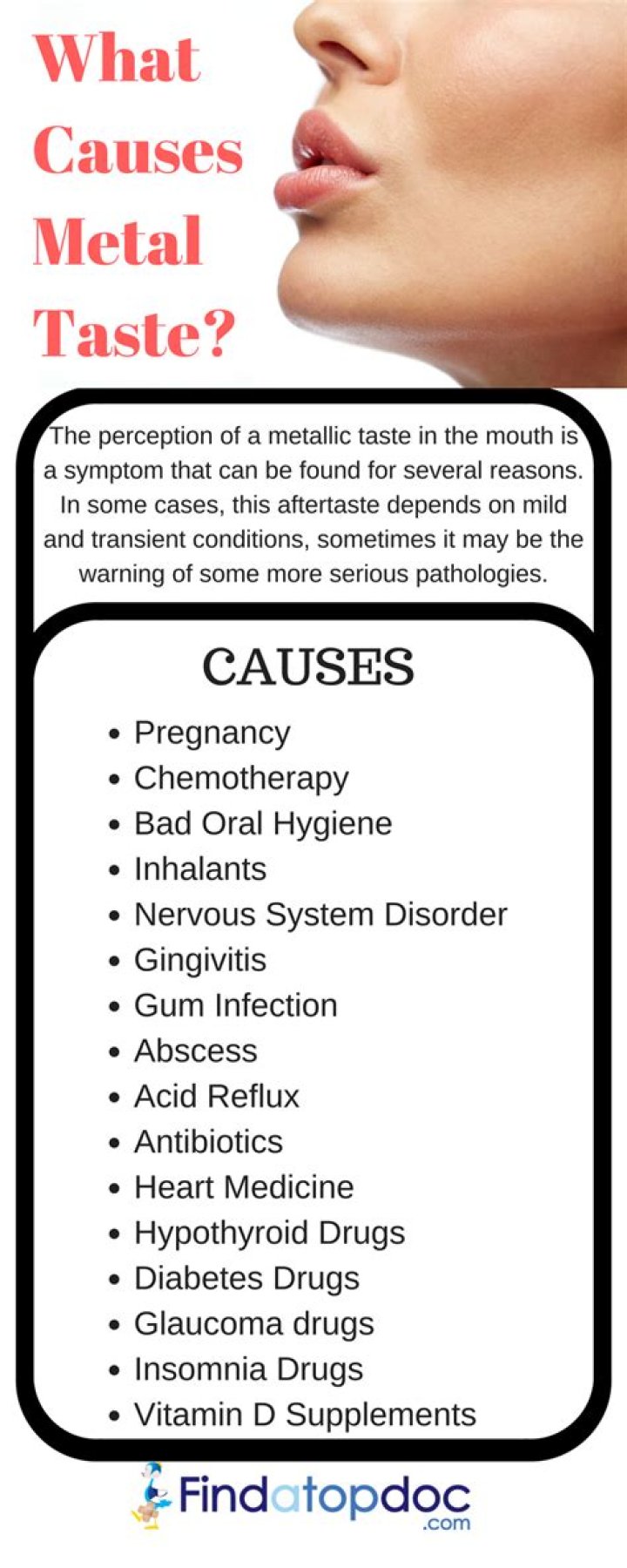 Common conditions that can cause a metallic taste A metallic or altered sense of taste can be due to the following conditions: Aging. Breathing through your mouth, which leads to a dry mouth. Dehydration.